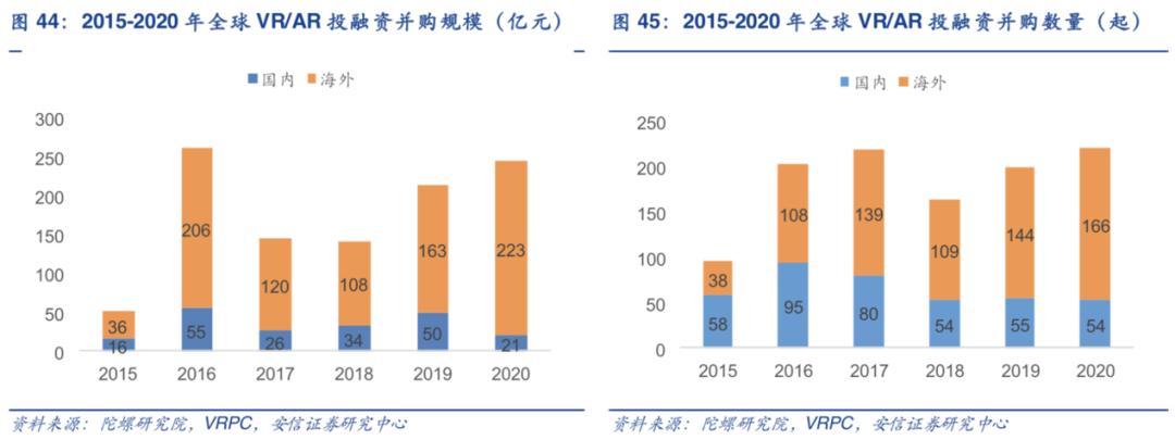 相关的融资规模也在扩大,据统计,2020 年全球 VR/AR 投融资规模达到 244 亿元,投融资并购发生 220 起,规模与数量均实现连续三年上涨。2018/2019/2020 年海外 VR/AR 投资规模分别为 108/163/223 亿元。安信证券认为,考虑到国外 VR/AR 产业领先国内 2-3 年,资本对行业的研究和理解更加深入且投融资活动更活跃,预计未来 2-3 年国内 VR/AR 初创企业将迎来一波并购热。