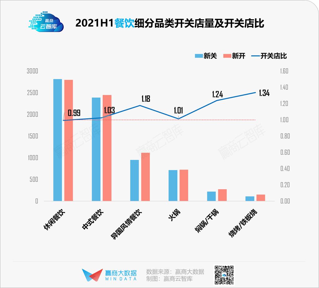 2021上半年,餐饮整体开关店比1.04,呈现小幅扩张。除了休闲餐饮开关店比略小于1外,其余细分品类均大于1,烧烤/铁板烧延续扩张态势,开关店比为餐饮中最高。