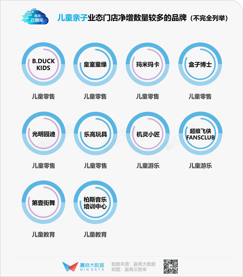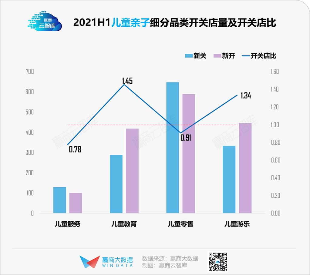 2021上半年,儿童亲子整体开关店比1.19,呈现明显回暖态势。“三胎”政策利好儿童相关消费,儿童教育、儿童游乐继续领跑,儿童零售、儿童服务收缩放缓。