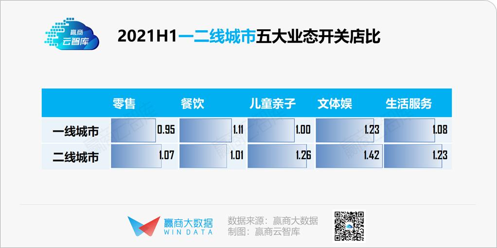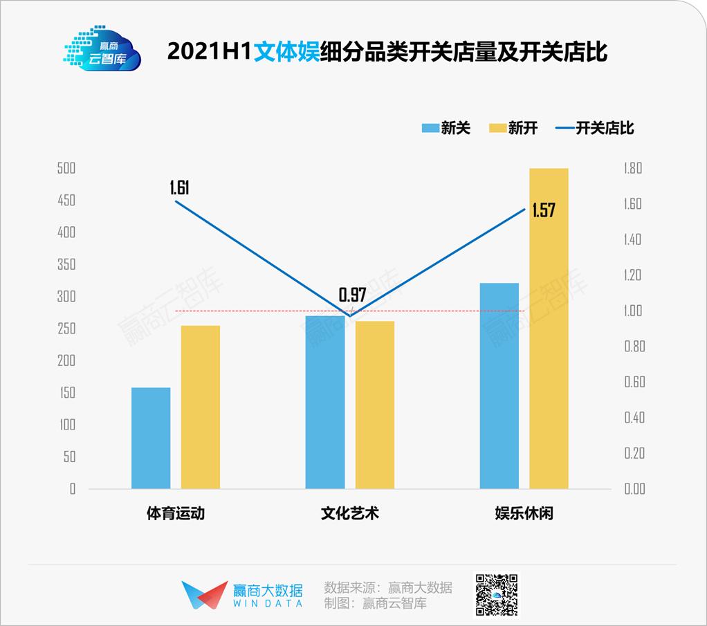 2021上半年,文体娱整体开关店比1.36,为五大业态中表现最优异者。其中,体育运动、娱乐休闲大幅扩张;文化艺术小幅收缩。