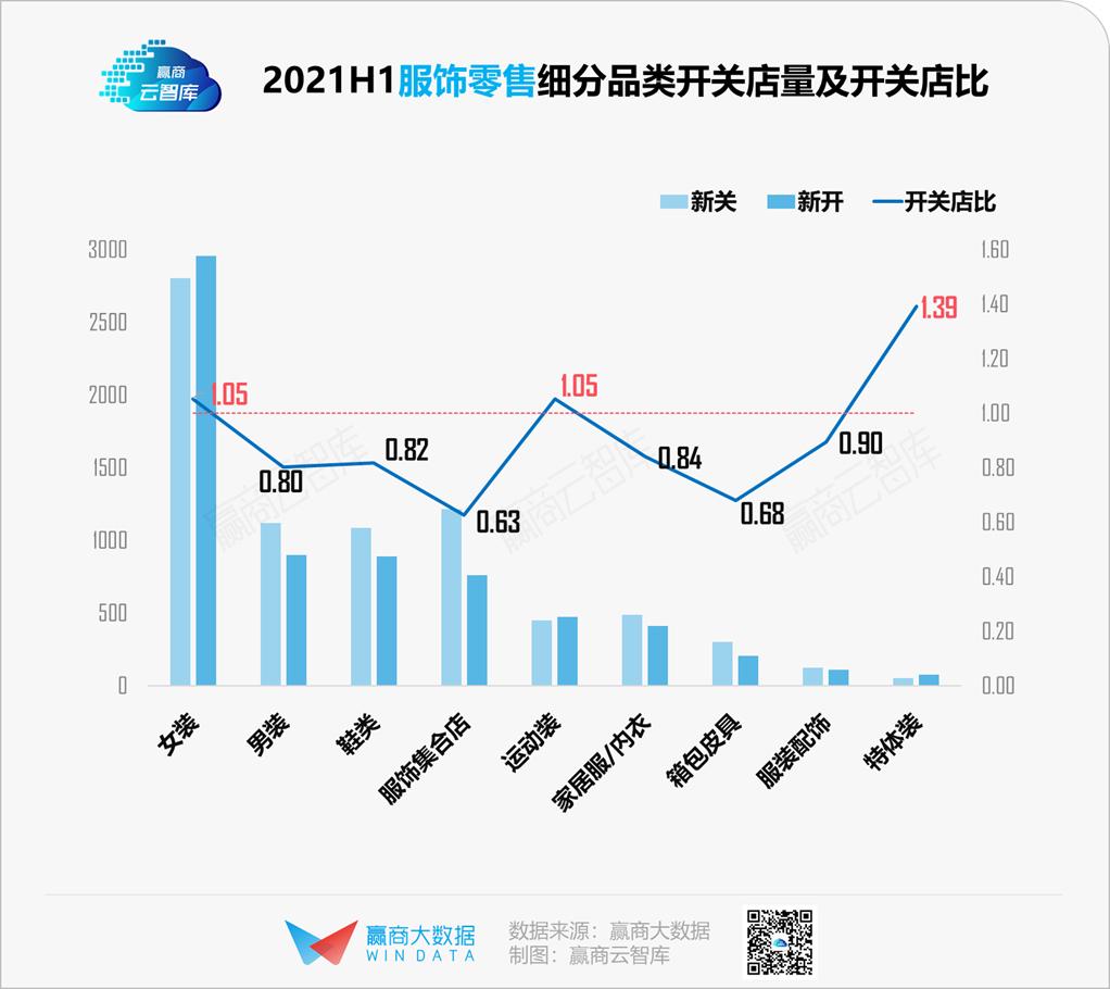 2021上半年,虽零售业态整体呈现上行,但服饰零售“拖后腿”——整体开关店比0.89,生存空间被其余业态分食。相比2020年开关店比0.72的数字,虽稍显回暖,但何时能摆脱颓势,仍是未知数。