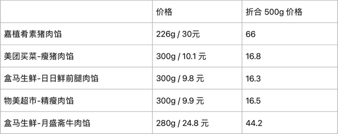肉馅的价格是每袋 226g,约 30 元。我搜集了几个平台的肉馅价格,可以看出植物肉馅价格还是远远高于普通肉馅的,甚至比牛肉的价格都还要高。