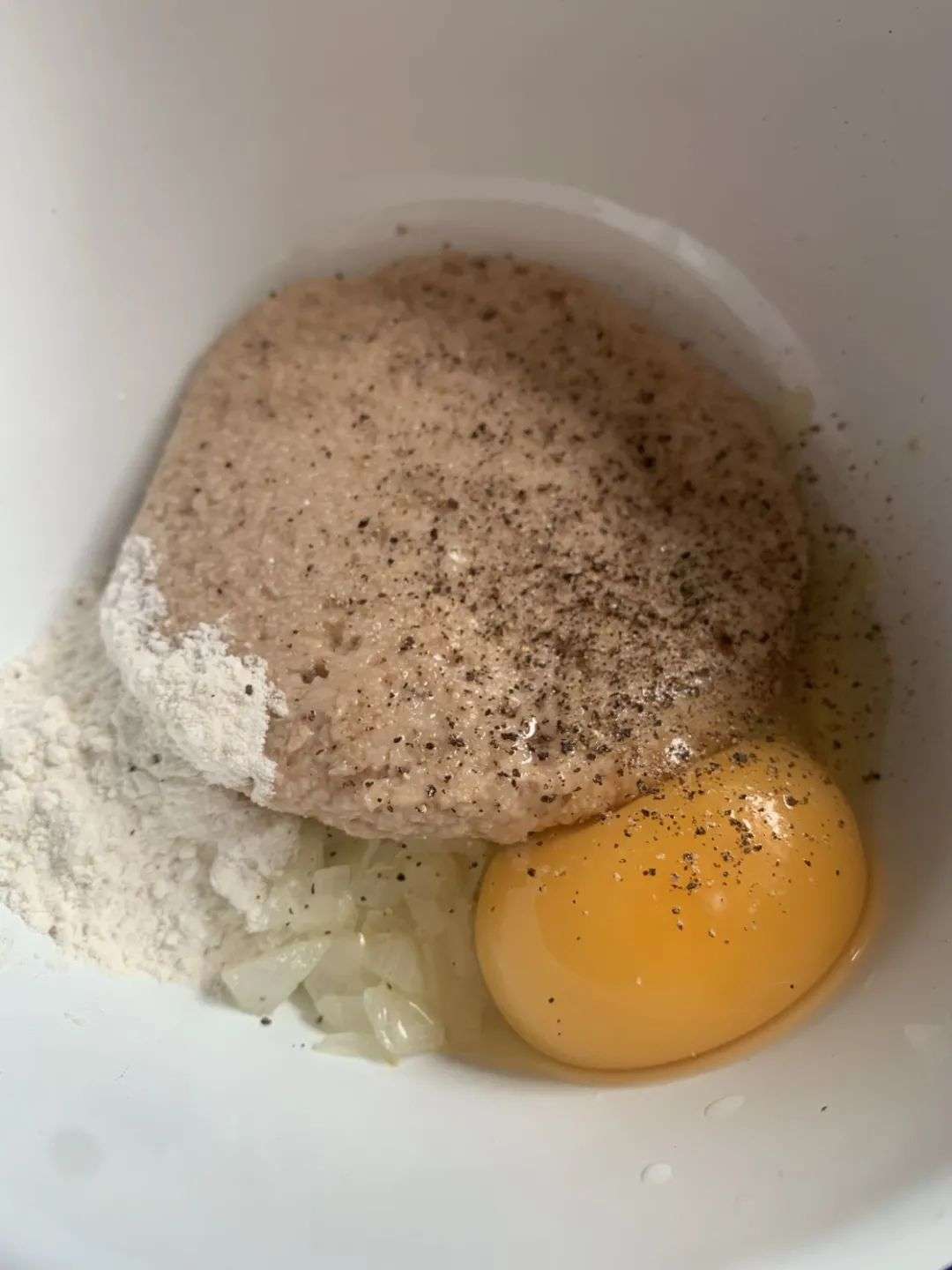 🍔️ 肉馅+鸡蛋+熟洋葱碎+面粉+牛奶+盐+黑胡椒