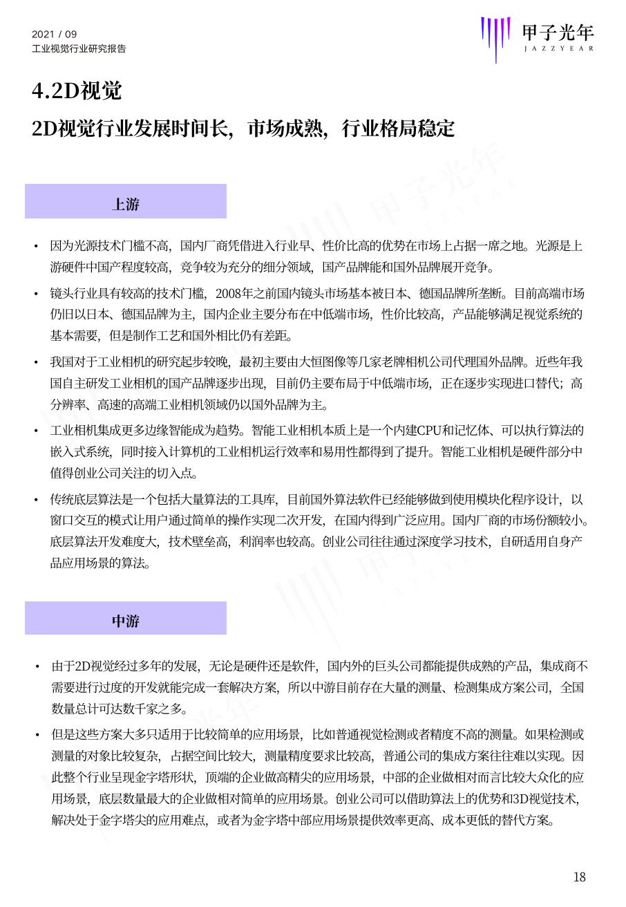机器视觉可分为2D和3D。3D是技术进步的结果,可以作为2D的补充。2D视觉发展时间长,市场成熟,行业上游壁垒明显,创业公司的机会主要在算法和集成解决方案;3D视觉处于行业发展初期,特征是“寻找增量”的逻辑强于“国产替代”,国内外巨头都不具备明显的技术优势,行业存在着大量新公司的机会,关键在于寻找合适的落地场景。