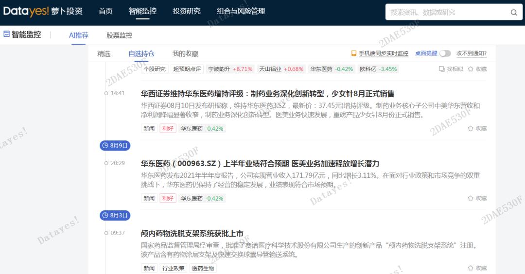 以萝卜投资AI推荐功能为例,比如投资者自选股中有华东医药,萝卜投资不但会推荐华东医药相关的新闻,还会举一反三,将研报里的相关内容、行业数据以及机构的持仓这些容易忽略的知识也主动推荐给投资者,便于投资者更全面了解投资标的信息。