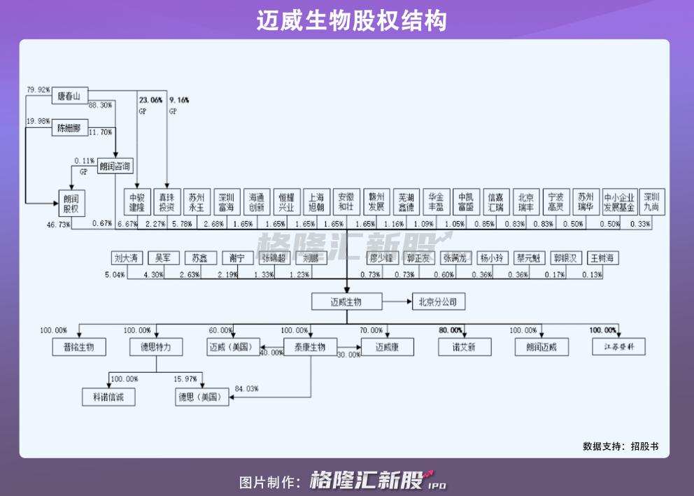 IPO前,唐春山、陈姗娜夫妇通过朗润股权、朗润咨询等合计控制迈威生物56.34%股权,为公司实际控制人;苏州永玉、深圳富海、海通创新则分别持有2.68%、1.65%、1.65%股份。