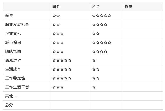 比如私企薪酬更高,就打5星;但工作稳定性更差,就打2星。