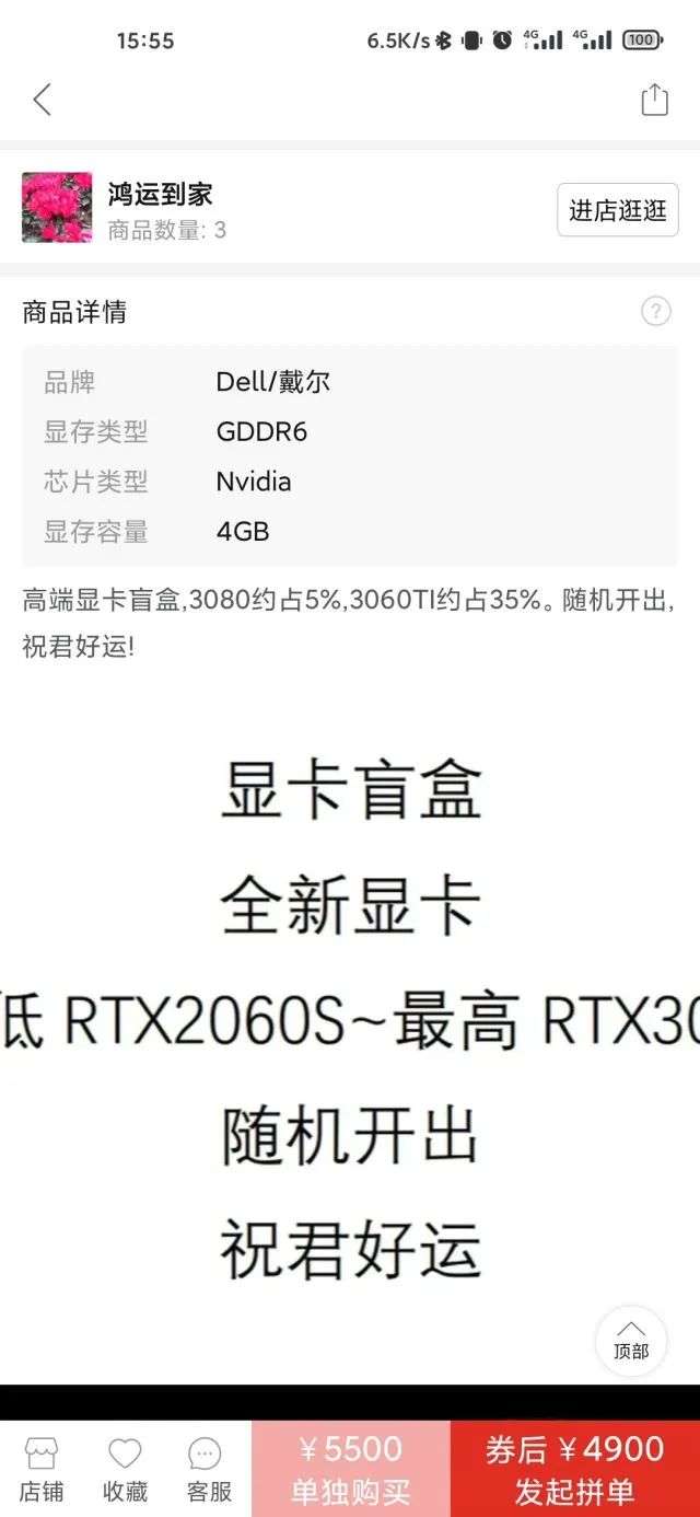 随着价格的提升,能够抽出的显卡型号也会有所不同,以拼多多的4900元显卡盲盒为例,其最低的保底显卡为RTX 2060,该型号的显卡在淘宝的售价为4000元左右,而最高则是能开出RTX 3080,该显卡目前的售价则超过一万元。
