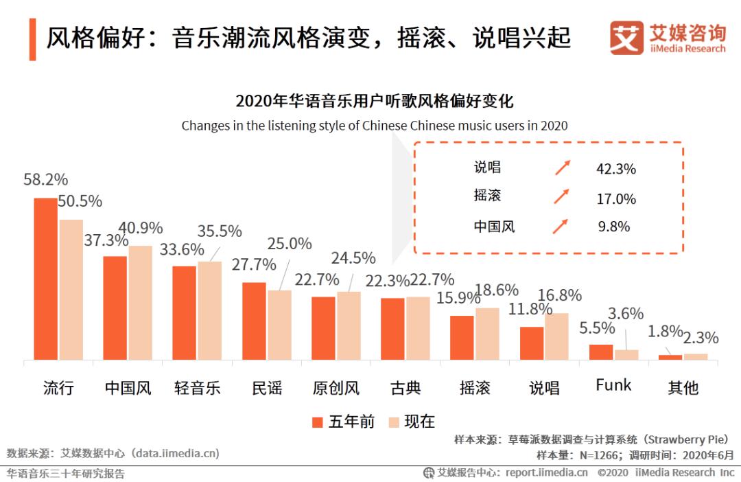而艾媒咨询发布的《华语音乐三十年研究报告》也显示,受众的音乐偏好风格正在发生变化。