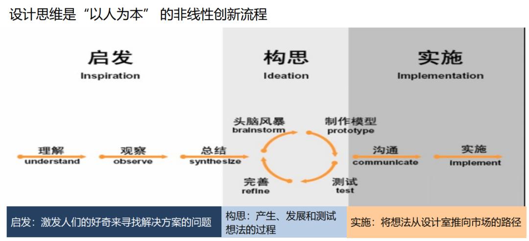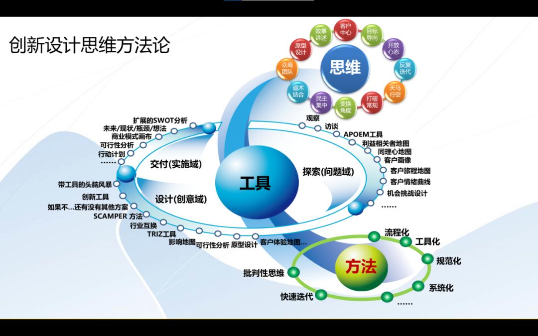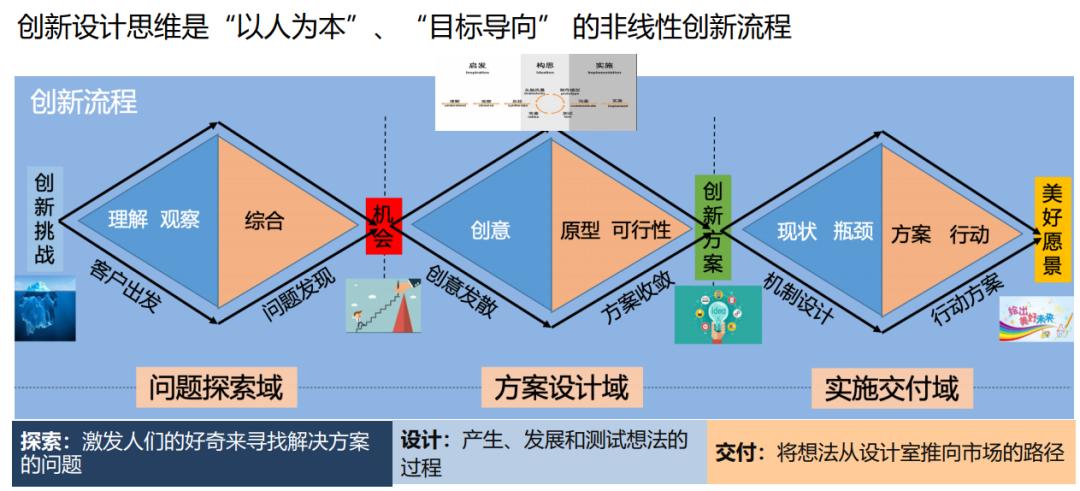 创新设计思维是以人为本、目标导向的非线性创新流程,也是实现创新设计的一套方法论和工具。工具是用来一步一步获得创新解决方案的步骤,它是逻辑思维的产物。