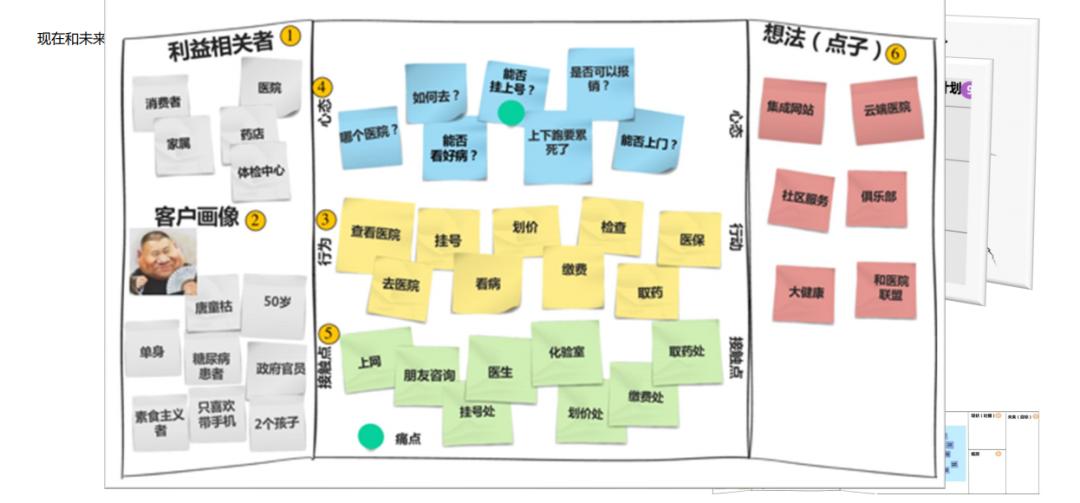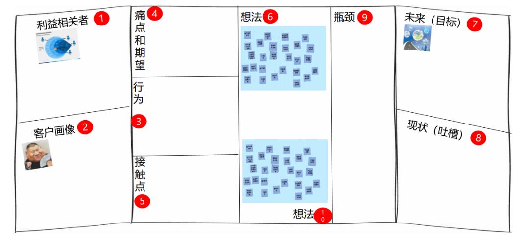 首先对于讨论的主题,利用利益相关者地图,找到关键的终端客户,利用同理心地图,将终端客户“附体”,到感同身受的获得他们的痛点、渴望,画出客户的情绪曲线。
