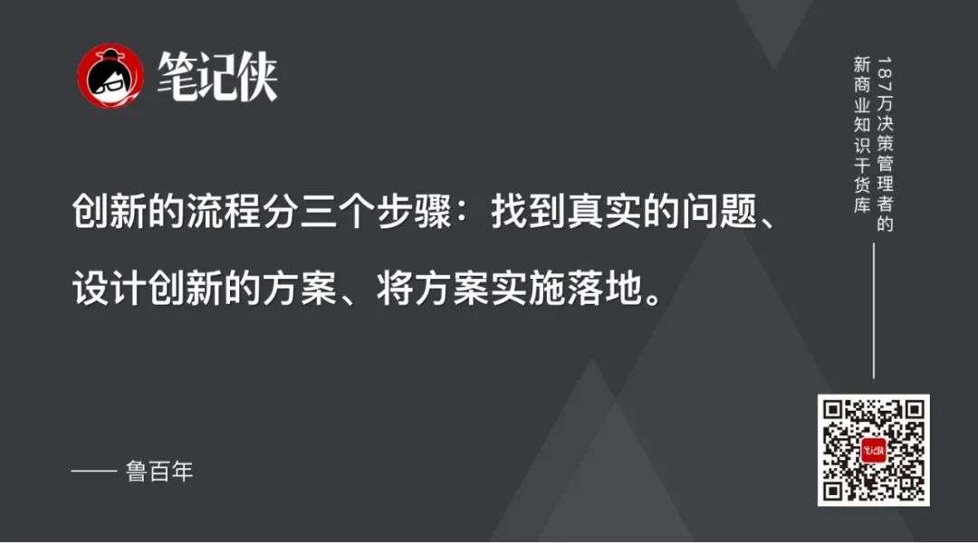 创新的流程分三个步骤:找到真实的问题、设计创新的方案、将方案实施落地。