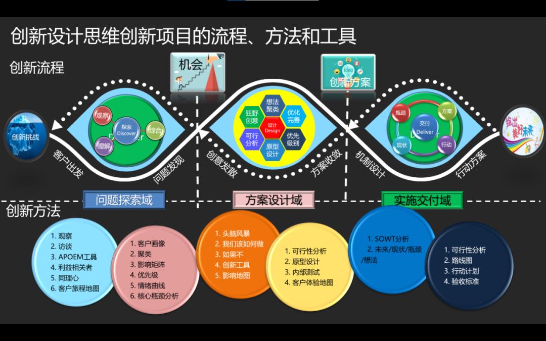 比如解决B2C的问题,有工具客户旅程地图,首先利用同理心,将客户附体,然后按照客户的行为,发现客户的痛点、渴望,找到创新的机会或者场景,最后找出解决客户问题的创新解决方案。