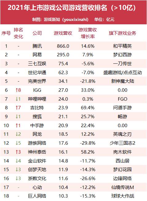 2021年上半年游戏营收超过10亿的有18家游戏公司,也是2020年游戏营收过20亿的18家公司:头5名分别是腾讯、网易、三七互娱、世纪华通和完美世界;守住半年10亿大门的也依然是心动和巨人网络。