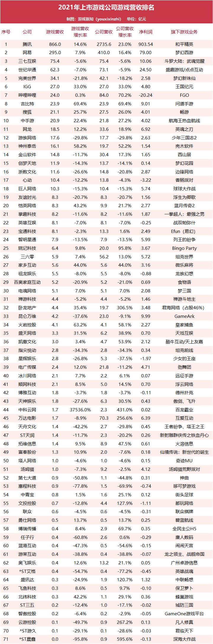 近期上市公司的2021年半年度报告相继公布,游戏新知统计了71家上市公司的营业情况。