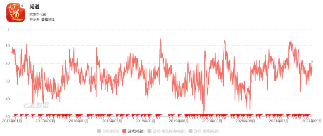 在基本盘上,《问道》手游上线同样已经超过五年,至今依然保持在iOS畅销榜TOP50。吉比特曾经在一年前公布过《问道》手游的营收数据,在2017~2019年的营收分别为9.3亿、11.9亿和15.7亿,到2019年营收收入占比更是逐渐攀升到超过7成。从排名可以推测,目前游戏的营收还没到走下坡路的时候。