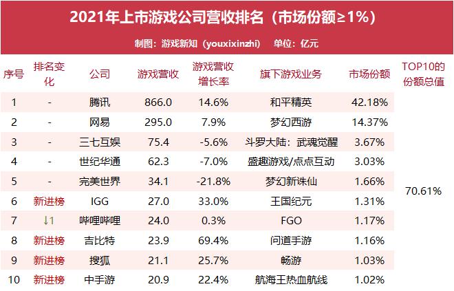 对比2020年年报,市场份额超过1%的游戏公司从7家上升到10家。新进入榜单的游戏公司包括IGG、吉比特、搜狐和中手游,挤出榜单的则是游族网络 (0.86%)。
