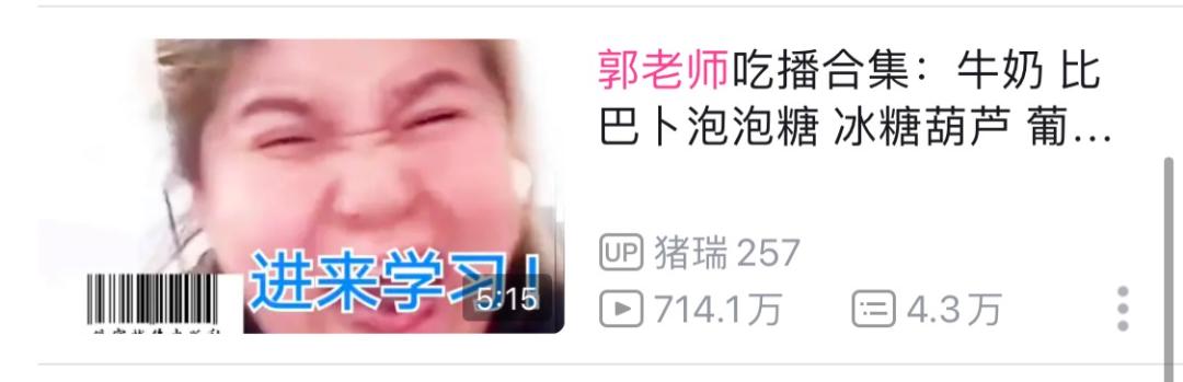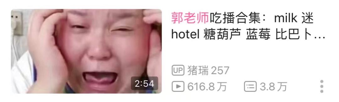 她那一套“迷hotel=猕猴桃”、“粗莓=草莓”、“新居=香蕉”、“谬可=牛奶”……的“郭言郭语”被爱玩梗的网友录屏下来上传到“爱玩梗的网友们聚集”的B站,一下子就爆红了,B站郭老师说着“郭语”做吃播的短视频合集动辄就是六七百万的播放量,更不用提有才华的网友动手的众多二创作品了。