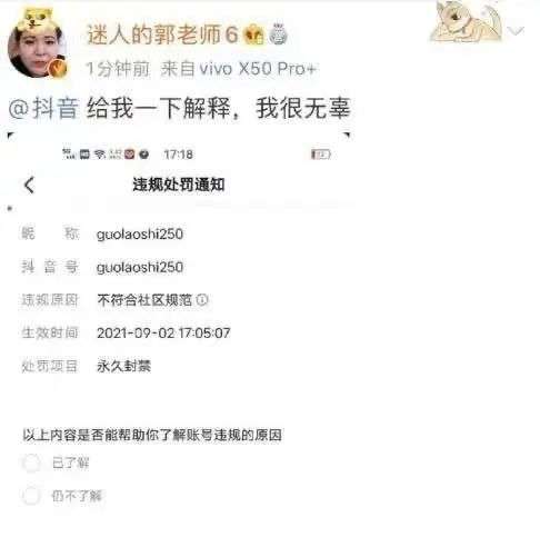 9月2日,拥有900万粉丝的短视频网红“郭老师”,发布微博称自己的抖音账号被永久封禁,艾特抖音官博,表示自己很无辜,需要抖音给出解释。