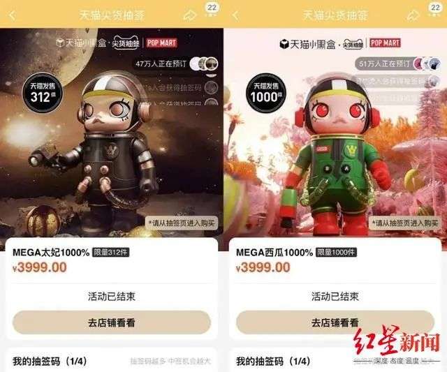 而最近一次,泡泡玛特在8月中旬推出的MEGA系列Space Molly西瓜和Space Molly太妃糖两款产品,仅在天猫一家平台,就有超过98万人参与产品抽签。两款产品的1000%规格,在天猫平台共限量发售1312套,400%规格预售15000个,上线后均1秒售罄。