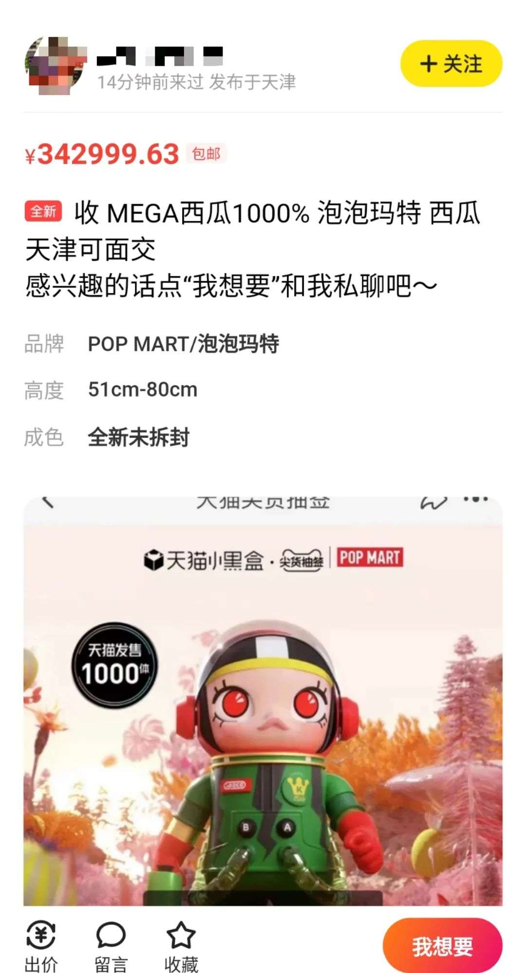 而“大娃”原价4999元,全球限量发售,需要抽签获得购买资格,8月底在咸鱼标价多在8万元左右, 现在不少卖家标到了10万元以上 。2021年9月7日,搜索咸鱼发现,超过30位卖家给这款娃娃的标价为99999元。 而且 ,价格似乎还有继续 上 涨趋势。