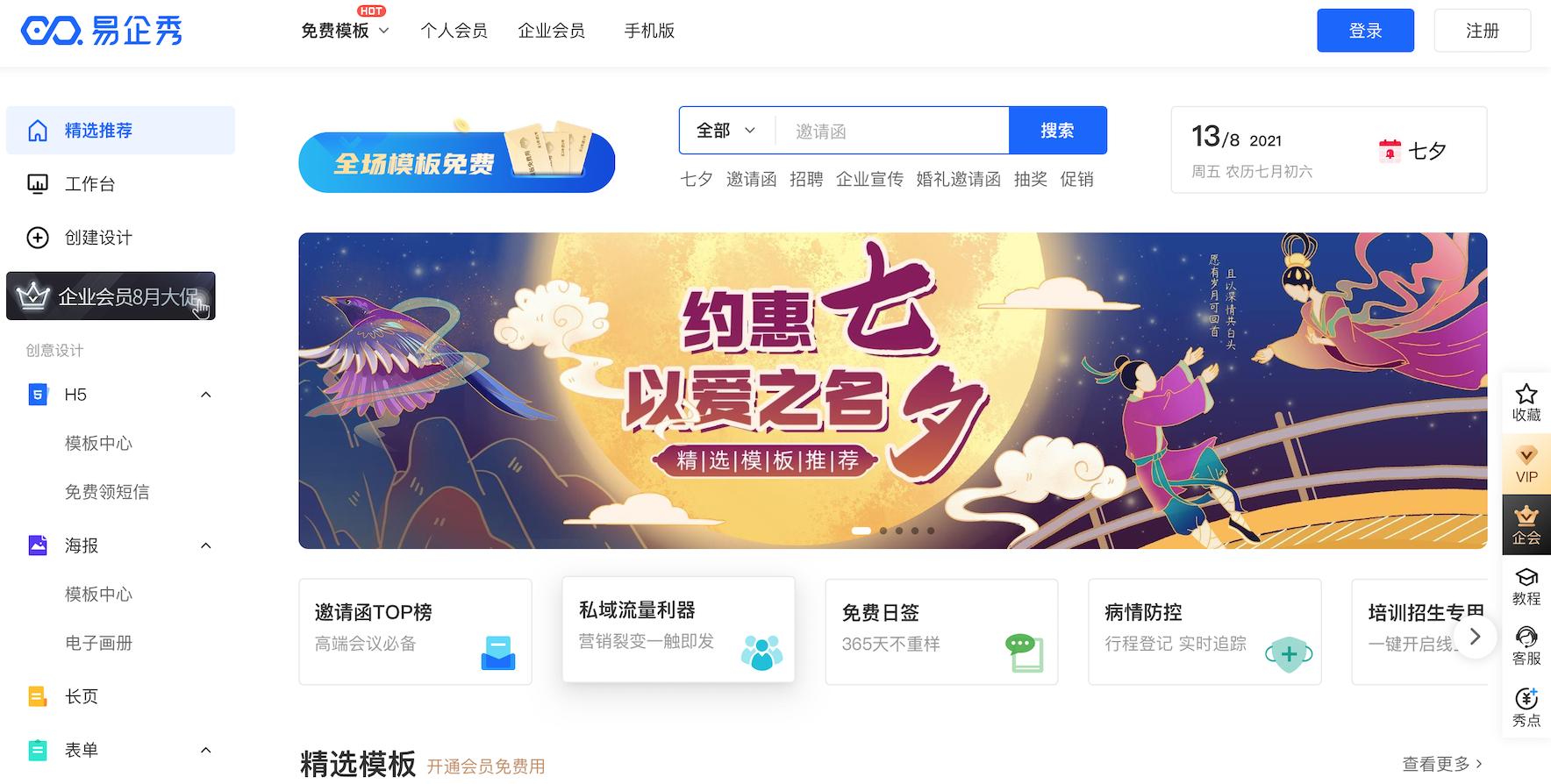 易企秀是一个基于智能内容创意设计的数字化营销软件,主要提供H5创意、海报图片、营销长页、问卷表单、互动抽奖小游戏和特效视频等各式内容的在线制作,且支持PC、APP、小程序、WAP多端使用,用户可以根据自己的需要自由选择使用端进行创意制作,并快速分享到社交媒体开展营销。