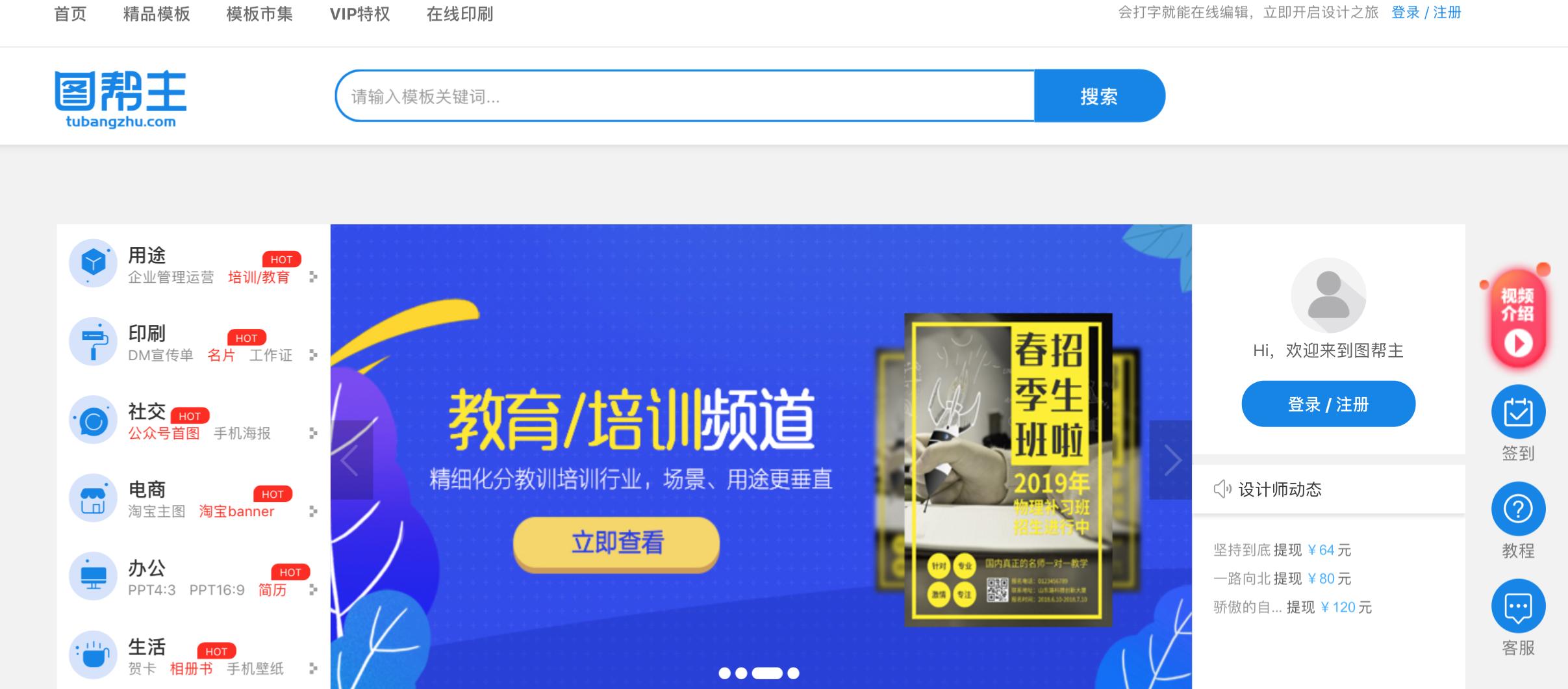 图帮主是设计小白最爱的懒人神器,30W加免费模版,托拉拽,秒出图,PC/手机同步、随时随地修改和下载。在线平面设计工具提供五大类50多个场景的海量模板,轻松满足创意不再受限于工具,还能发布代改需求,便捷高效。