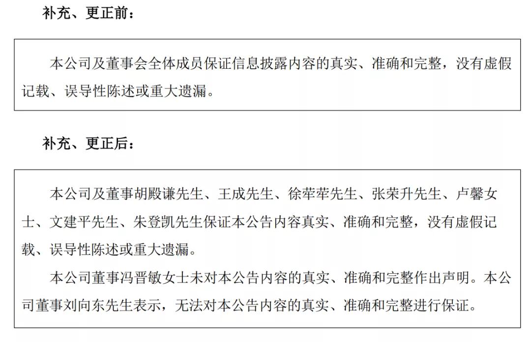 9月5日晚间,上市公司再度发布关于深交所问询函回复的补充更正公告,将本公司及董事会全体成员保证信息披露真实性,更改为董事冯晋敏士未对本公告内容的真实、准确和完整作出声明,董事刘向东先生表示,无法对本公告内容的真实、准确和完整进行保证。