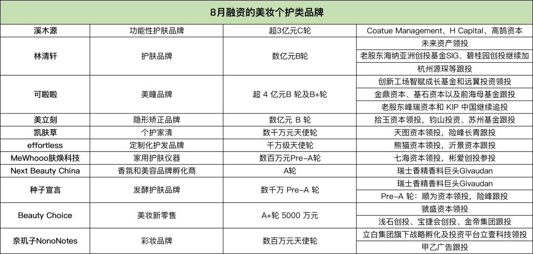 其中共计14个食品饮料品牌获得融资,包括2个植物肉品牌和1个细胞肉品牌,以及两家零食渠道品牌;共计10个美妆护肤品牌拿到了融资,其中,「溪木源」拿到了超过3亿元C轮融资,「林清轩」拿到了数亿元B轮融资。