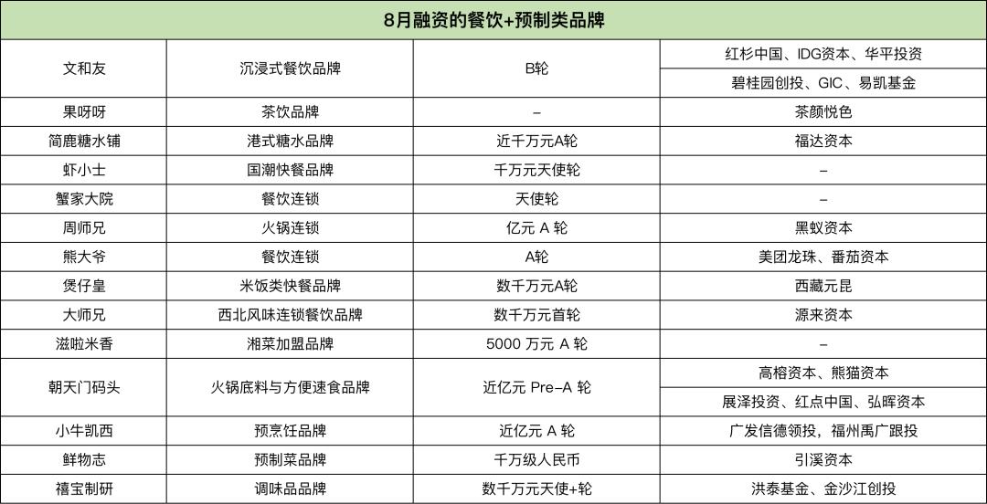 8月融资的餐饮品牌有近10个,除了偏沉浸式餐饮体验的文和友和火锅连锁品牌周师兄,以及客单价超过300元的蟹家大院,其他均为客单价在30元左右的中式快餐,覆盖了饺子(熊大爷)、煲仔饭(煲仔皇)、铁板饭(滋啦米香)、手工面(大师兄)等标准化程度高的品类。
