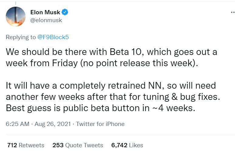 8 月 26 日,马斯克又发推文表示,该公司将于 9 月 10 日午夜开始在其早期访问计划中向客户推出 FSD 10 版本 。然后,该软件“将需要再过几周进行调整和错误修复”,马斯克估计这将需要四个星期。届时,将向更多特斯拉客户提供“公测按钮”,预计将以下载按钮的形式提供给购买 FSD 软件包的用户。