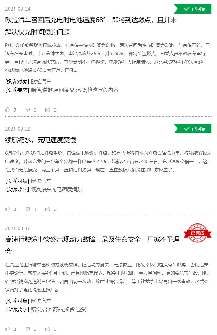 此外,欧拉品牌存在的问题也不少,“续航缩水”“充电时电池发生高温现象”“高速出现动力故障”等等,这些显然远比未按时交付要更加严重。