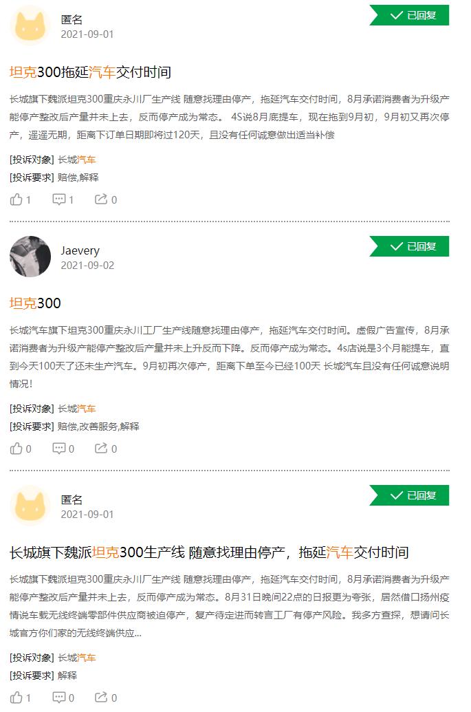 但这可能只是表面现象。据黑猫投诉平台显示,坦克系列存在拖延汽车交付时间的问题,且据投诉网友表示,坦克300重庆永川厂生产线随意找理由停产,承诺消费者为升级产能停产整改后产量并未上去,停产反而成为常态。