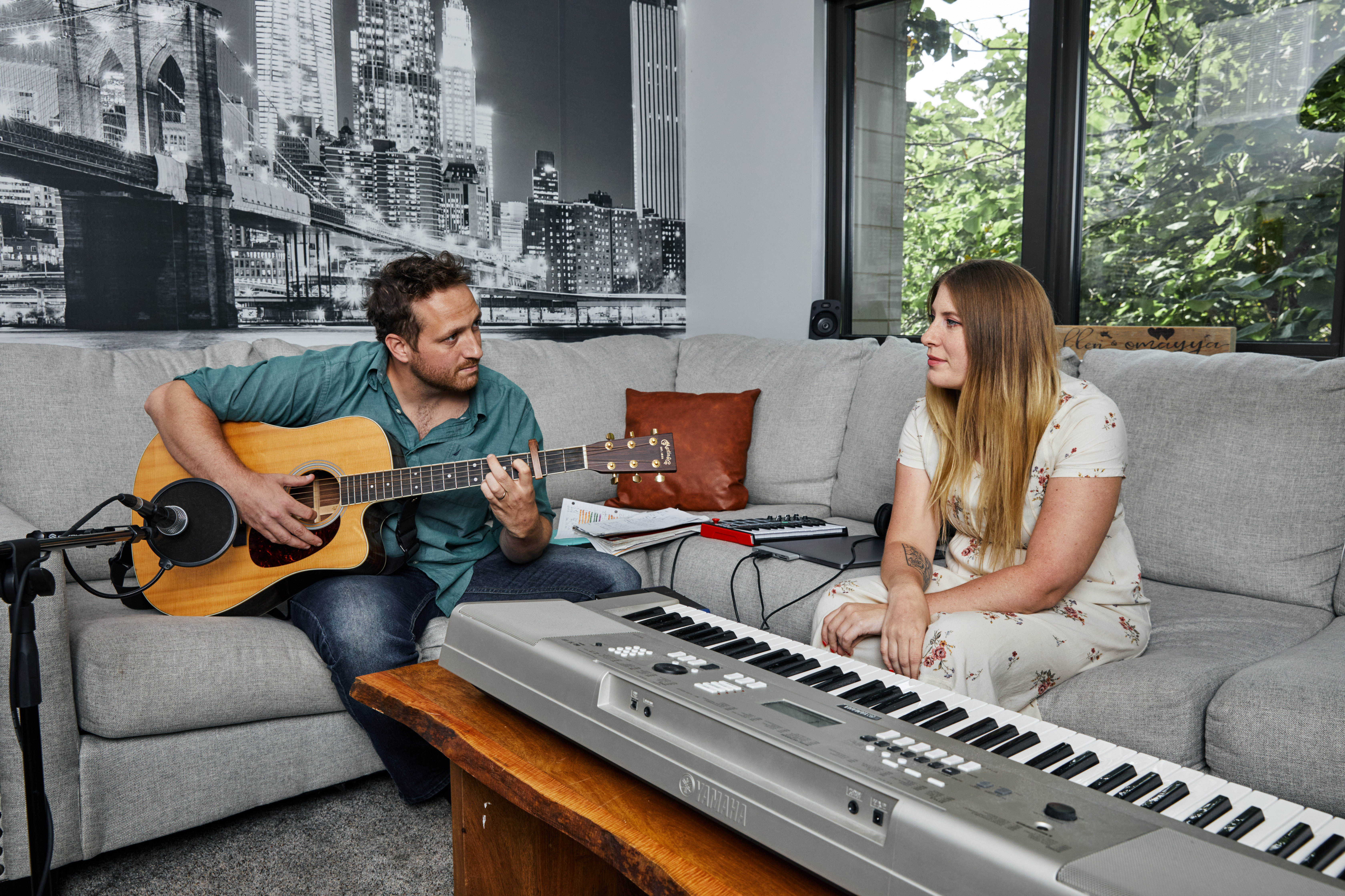 2021年8月13日,Omayya Atout和Ellen Hodges在他们位于田纳西州查塔努加的家中。阿图特和霍奇斯建立了一个网站,并开设了一家名为Songlorious的公司,为婚礼、生日和类似活动编写定制歌曲。摄影 Diana King | 图片来源 《纽约时报》
