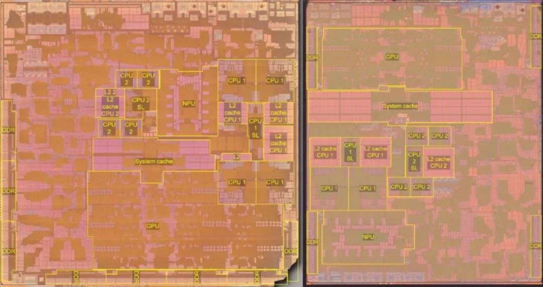 从半导体公司Techlnsights公布的两款芯片分析图可以看出,M1芯片拥有4个性能核心和4个能效核心,CPU总共加起来有8个核心。相较之下,A14仿生少了两个核心,CPU总核心数为6个,包括两个性能核心和4个能效核心。