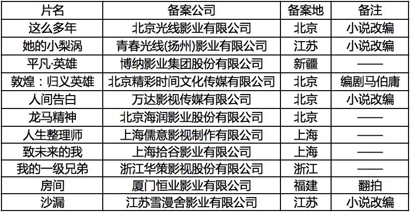 新一期电影备案: 光线、博纳、万达、儒意等公司均有大项目亮相