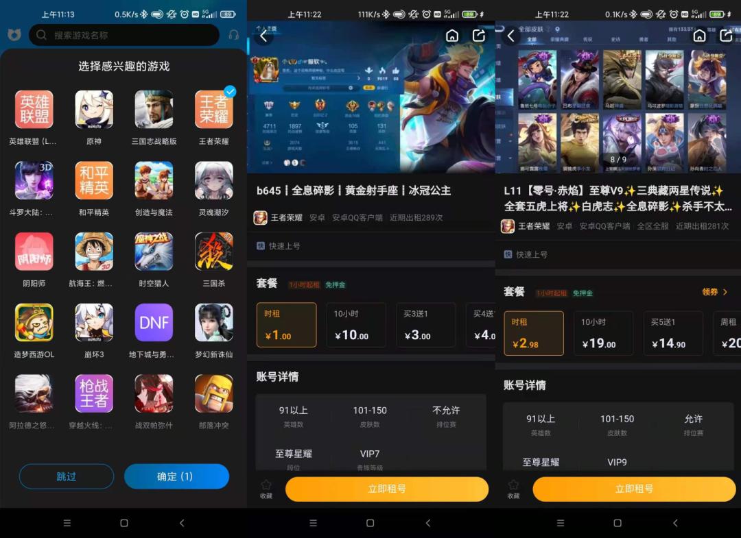 小雷选择了一款下载量较高的账号交易平台,可以看到主流电脑端游戏、手机游戏的账号都可以在这些平台上租到。以《王者荣耀》游戏账号为例,一个较高级别的V7账号玩一个小时只需要1元,拥有大量皮肤的V9账号玩一个小时只需要2.98元,用户甚至还能领取满20-4元优惠券,只要十几块就能畅玩一整天。