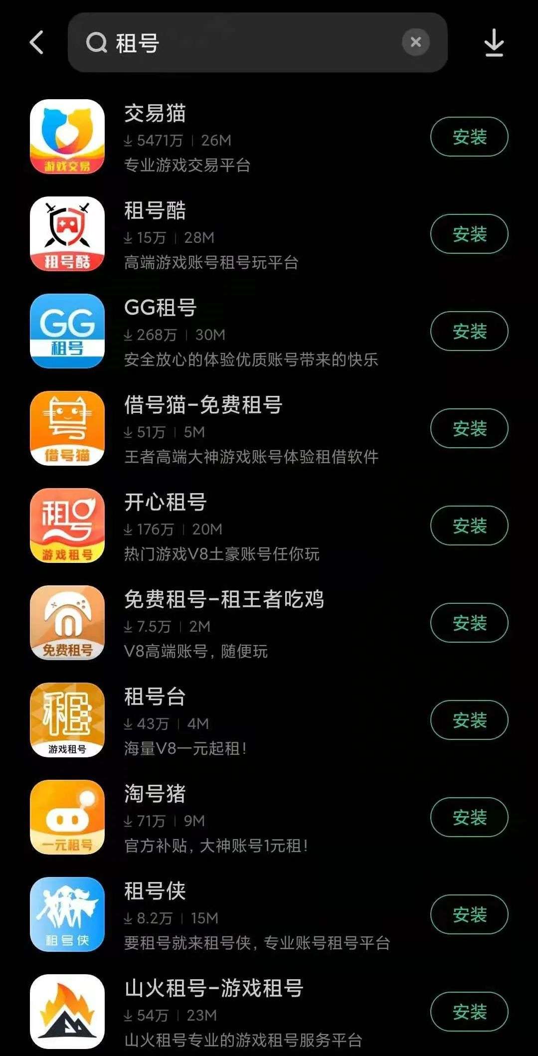 带着这个疑问,小雷决定展开调查。尽管我国法律明令禁止向未成年人出售网游类商品,但是目前市面上的账号交易平台数量可是一点不少。随便打开一个应用商店,输入“租号”关键词,便可以轻松查找到大量的账号交易平台。从下载量来看,这些账号交易平台的用户数绝对不少。
