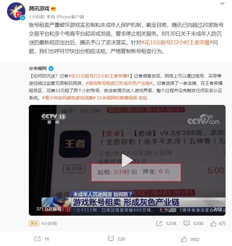 在央视曝光此次事件后,腾讯游戏官方迅速跟进,他们表示,账号租卖这种行为严重破坏游戏实名制和未成年人保护机制,需要国家出台相关法律法规予以取缔。与此同时,腾讯已向超过20家账号交易平台和多个电商平台起诉或发函,要求停止相关服务。