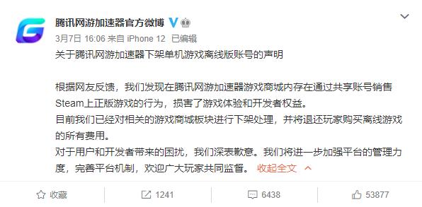 对此,腾讯网游加速器官方微博发布声明称:目前已经对相关的游戏商城板块及由GameUp提供的第三方服务进行下架处理,并将退还玩家购买离线游戏的所有费用。对于给用户和开发者带来的困扰,我们深表歉意。我们将进一步加强平台的管理力度,完善平台机制,欢迎广大玩家共同监督。