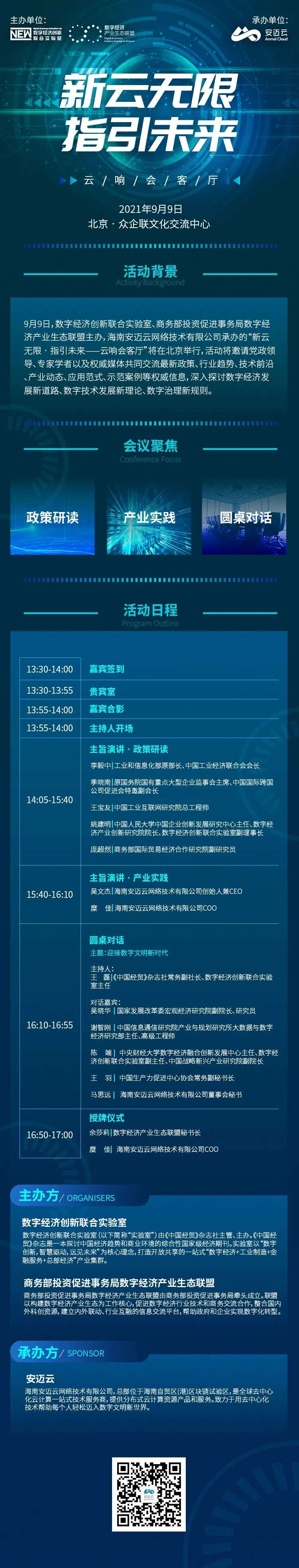9月9日, “新云无限·指引未来”云响会客厅,将在北京众企联文化交流中心举行。此次活动由数字经济创新联合实验室、商务部投资促进事务局数字经济产业生态联盟主办,安迈云承办。活动主题将聚焦“数字经济”,邀请党政领导、专家学者以及权威媒体现场交流行业新政、行业趋势、技术前沿、产业动态以及应用示范等内容,探讨数字经济发展新道路、数字技术发展新理论、数字治理新规则。