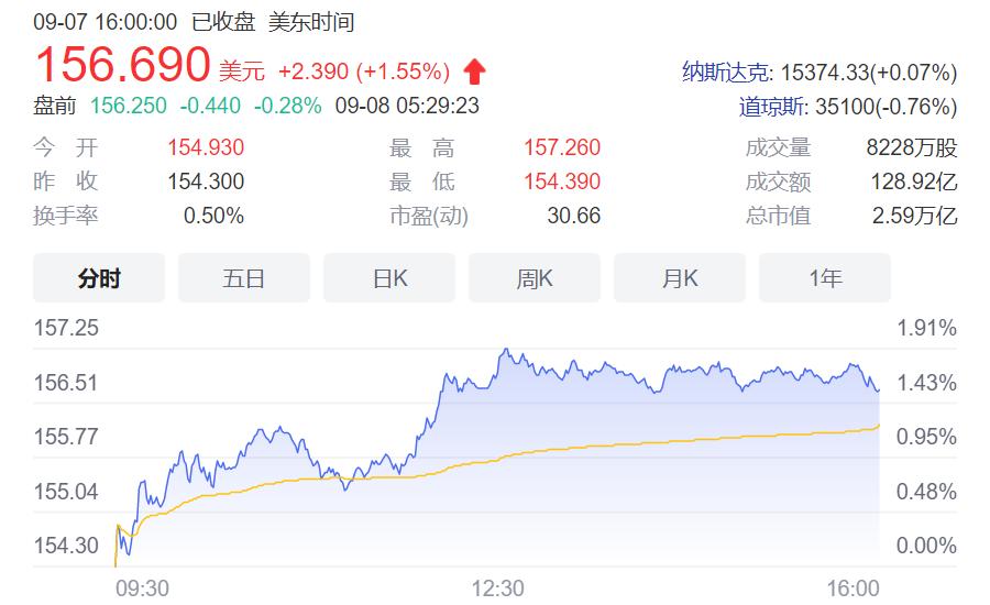北京时间9月7日晚间,美股盘中,苹果股价再度大涨,最高报157.26美元/股。截至收盘,苹果涨1.55%,报收156.69美元/股,总市值近2.6万亿美元。