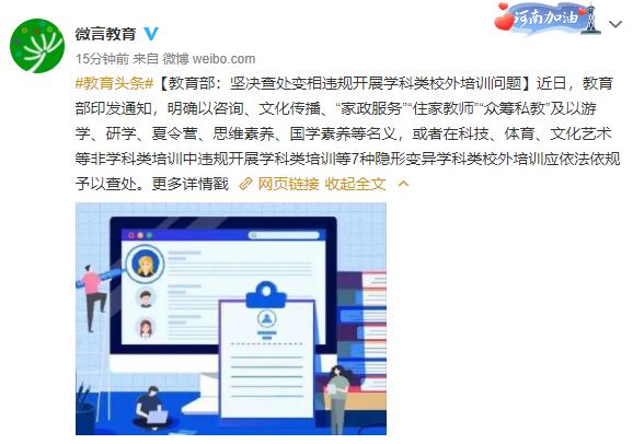 9月8日,据教育部网站消息,近日教育部办公厅发布通知,要求坚决查处变相违规开展学科类校外培训问题。