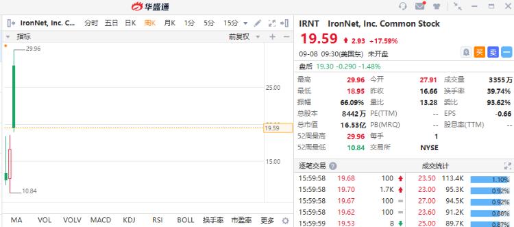 IronNet (IRNT)连涨两个交易日,累计涨超45%,昨日(9月7日)盘前交易一度上涨115%,开盘上涨67%,最终收涨近18%。