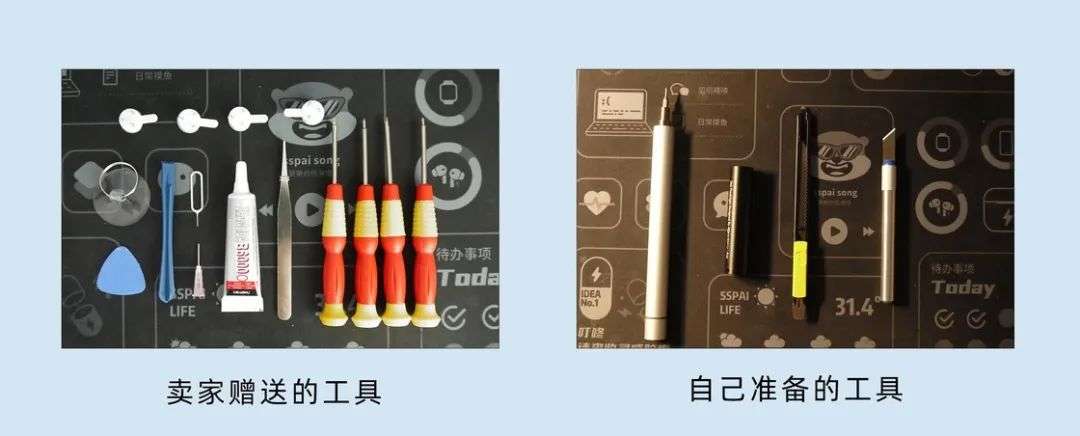 在拆机过程之中,建议额外准备一套螺丝刀(包括各种拆机常用螺丝批、不会发生螺丝批滑丝)、一个手电筒(光线不好的时候照螺丝用)、多准备几块撬片、弯头镊子(拿取各种螺丝很方便)、雕刻刀(下文装裱时可能会用到)、规整收纳螺丝小部件的收纳盒。