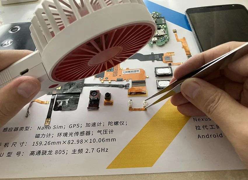 拆机的过程中可以拍一下当时的照片,以便后续装裱时确定部分元器件连接位置。接下来就是拆解左侧部分了。用镊子打开左侧右下角的小机关,然后将手机的中框、电池、显示屏、主板渐次分离。拆机的时候需要提醒的是,拆卸手机电池的时候一定要小心,尤其是鼓包的电池。不要好奇心过剩,用针去扎鼓包的电池。