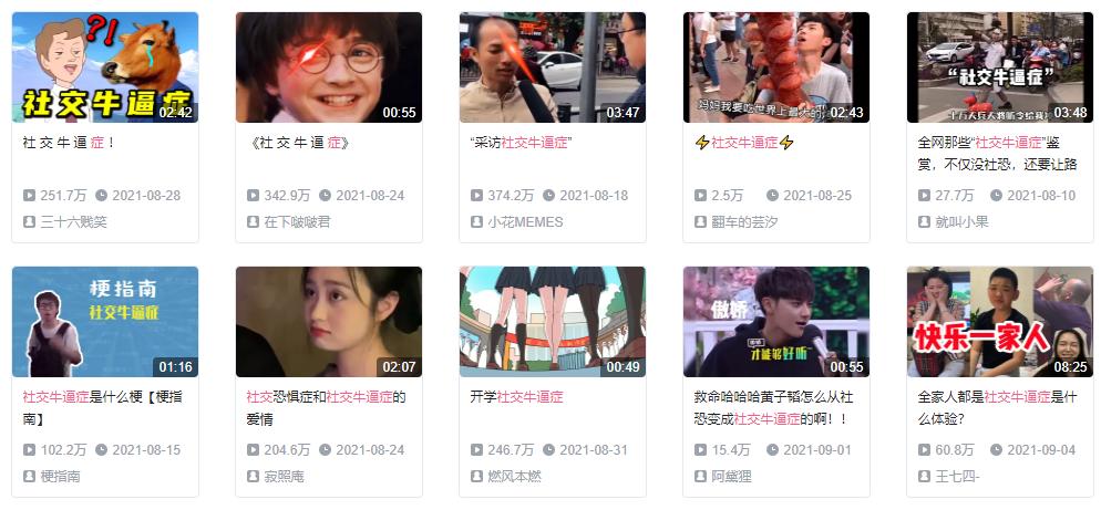 也许是受到了年轻人社交力的感化,在B站搜索“社交牛逼症”,你会发现不少UP主都围绕社交牛逼症开始了解读和创作。