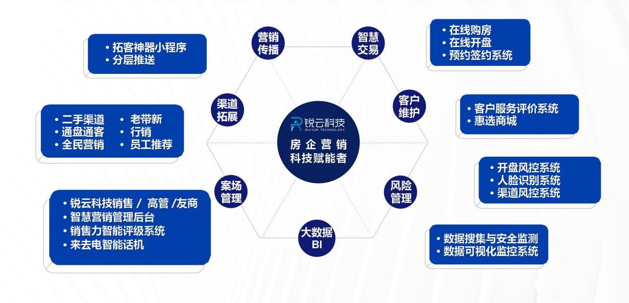 经过6年的经营,目前「锐云科技」已研发落地悦置智慧地产营销管理体系7大系统、24项产品。其中,核心产品——案场智慧管理系统、线上售楼智慧管理系统、渠道智慧管理系统、智慧风控系统,力图解决案场管理、线上获客、渠道管控的难题。