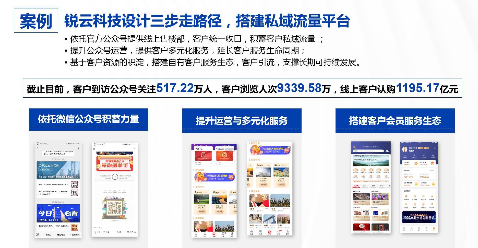 以「锐云科技」和「中国保利集团有限公司」(以下简称「保利集团」)的合作为例,「锐云科技」为依托官方公众号为「保利发展」(即保利地产)提供线上售楼部,进行客户统一收口,积蓄客户私域流量。在公众号运营过程中,则为客户提供多元化的服务,延长客户服务生命周期。最后,基于客户资源的沉淀,「锐云科技」赋能「保利发展」搭建自有用户服务生态,将客户从公众号引流至APP端,支撑平台长期可持续发展。