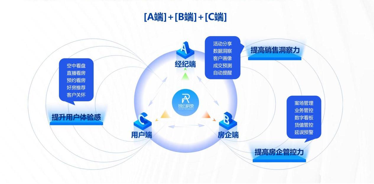基于案场的标准化管理,「锐云科技」打通A端经纪人平台、B端房企数字营销管理平台、C端客户私域流量平台,实现三端的高效闭环以及地产数据互联互通,因此成为全国首家大数据云计算应用落地地产营销的科技企业。